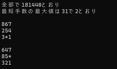 定義したメソッドで最短手数が最長になるものを探します。すると31手になるものが2つあることがわかります。
