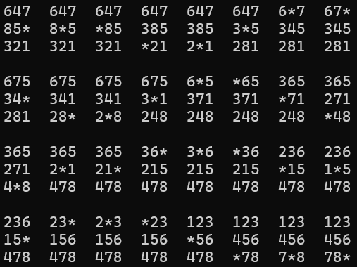 class Program { static void Main() { int N = 3; string start = "12345678*"; (Dictionary<string, int>, Dictionary<string, string>) ret = Bfs(start, N); Console.WriteLine($"全部で{ret.Item1.Count}とおり"); var pairs = ret.Item1.ToArray(); int max = pairs.Max(_ => _.Value); pairs = pairs.Where(_ => _.Value == max).ToArray(); Console.WriteLine($"最短手数の最大値は{max}で{pairs.Length}とおり"); Console.WriteLine(); void ShowCells(string s) { for (int i = 0; i < 3; i++) Console.WriteLine(s.Substring(i * 3, 3)); Console.WriteLine(); } foreach (var pair in pairs) ShowCells(pair.Key); } } |
