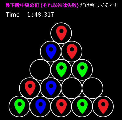 釘を飛び越して消していくパズルPC スマホ 対応 釘を移動し、飛び越えた釘を消していきます。残りを1つだけにすればクリアというパズルゲームです。 (2026-0323 追加) |