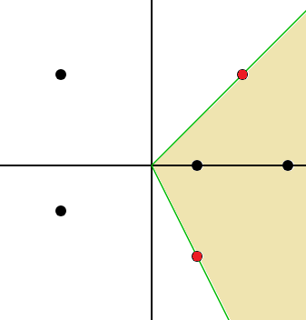 外積が同じなら2点は同一直線です。ただしこれだけだと原点を挟んでいる(180度ズレている)かもしれないので上下どちらの半平面に属するかも確認します。